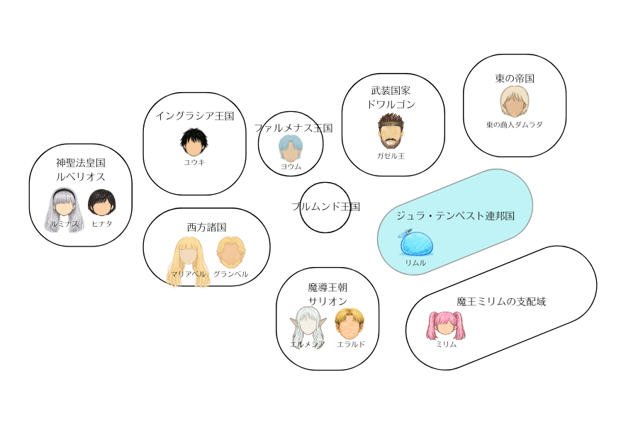 神聖法皇国ルベリオスを中心とした勢力。リムルと「100年の不可侵条約」を結んだことで、これまで魔物を敵視してきた教義との間で、どのように折り合いをつけていくかが今後の焦点となります。